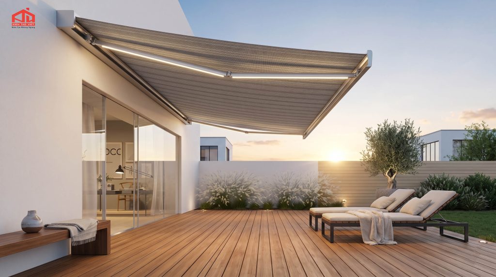 Mái che bạt là lựa chọn phổ biến nhờ chi phí hợp lý và khả năng linh hoạt cao. Hệ thống bạt có thể kéo tay hoặc điều khiển điện, dễ dàng thu gọn khi không sử dụng. Loại mái này phù hợp với nhà phố, quán nhỏ hoặc khu vực cần che phủ tạm thời. Chất liệu bạt chuyên dụng hiện nay có khả năng chống nước, chống tia UV và độ bền tương đối tốt trong điều kiện thời tiết Việt Nam.