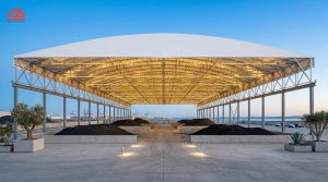 Khung mái thường được chế tạo từ thép hộp sơn tĩnh điện hoặc inox, kết hợp với bạt PVC cao cấp hoặc polycarbonate. Nhờ đó, mái có độ bền cao, khả năng chống tia UV, kháng nước, chịu được mưa lớn và gió mạnh. Đặc biệt, thiết kế uốn cong mềm mại của mái vòm mang lại sự sang trọng, giúp công trình trở nên nổi bật.